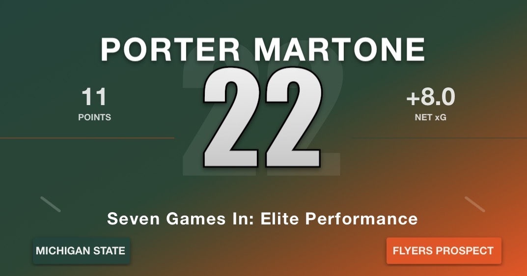 Seven games into his Michigan State career, the Flyers’ 6th overall pick isn’t just meeting expectations—he’s crushing them. With 11 points (4 goals, 7 assists) through seven games, Martone is doing exactly what I predicted he would: dominating from high-danger areas, operating on the power play like a young Stamkos, and—here’s the kicker—making everyone around him significantly better.